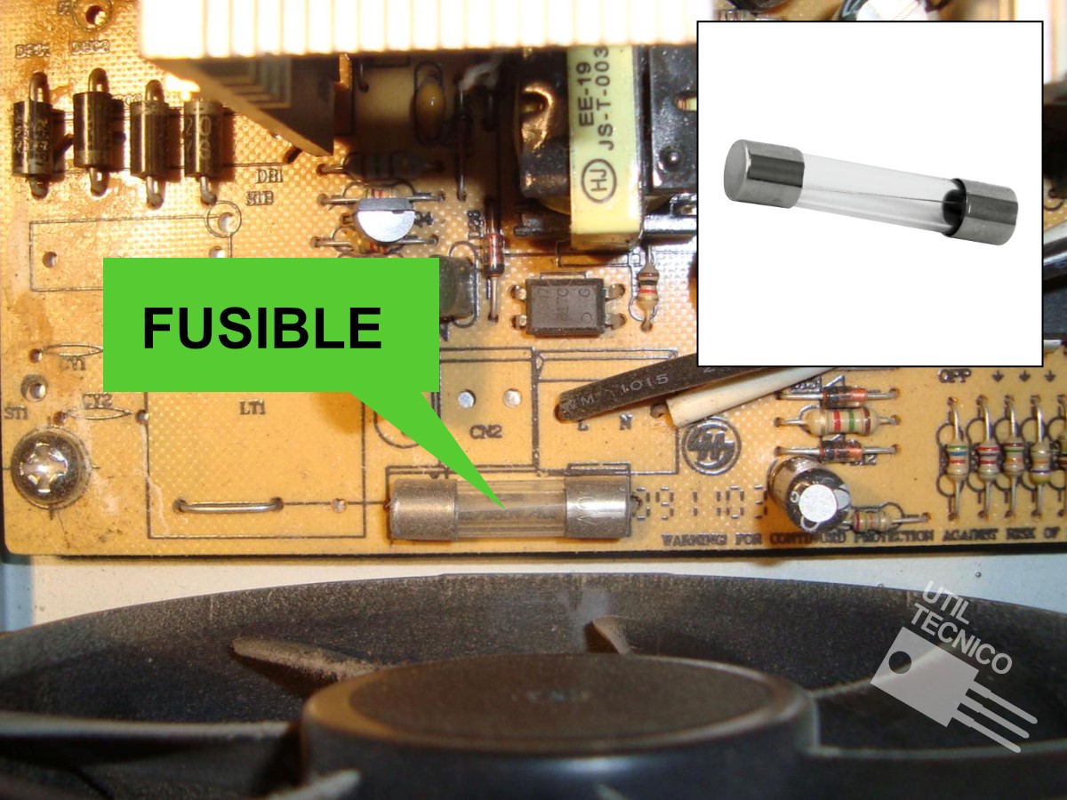 El fusible es el componente más inmediato a la linea de la red eléctrica y el primer elemento de protección, también es lo mas sencillo de comprobar, en ocasiones incluso se puede ver a simple vista que esta quemado. Para medir un fusible si esta en buen estado utilizaremos un multimetro, no sera necesario desoldarlo. Seleccionamos en la escala de diodos (continuidad) y tocamos cada uno de los extremos metálicos del fusible, si no escuchamos ningún sonido significa que no hay continuidad en el multimetro y el fusible esta cortado. Su costo es de pocos centavos así que procedemos a remplazarlo.