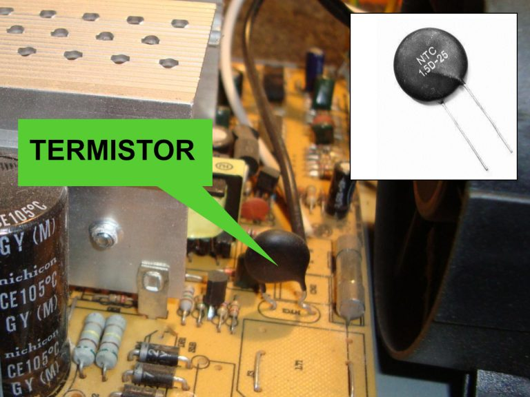 El termistor en este tipo de fuentes esta en serie como un elemento mas de protección. Es similar a un capacitor cerámico de los de tipo lenteja, lo diferenciamos básicamente por la ubicación y el color, que puede ser negro o verde, en las fuentes de computadoras vamos a encontrar Termistores NTC es decir de Coeficiente de Temperatura Negativo. Los Termistores disminuyen su resistencia al aumentar la temperatura, están instalados en las fuentes para protegerla durante el arranque. El Termistor es un tipo de resistencia y como suele pasar a estos componentes al romperse se "abren", para comprobarlos lo haremos de la misma forma que el fusible, con el multímetro en escala de continuidad mediremos entre sus dos terminales si hay continuidad, si el termistor está funcionando observaremos una valor en el display del multímetro. En caso de necesitar remplazo y no lo conseguimos, podemos utilizar el de otra fuente.